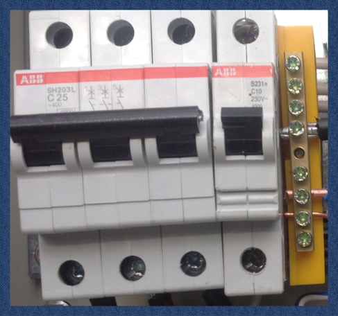 Рядом, на DIN рейке, ставим трехфазный (строенный) вводной автомат 3 х 25А. Этот вводной автомат обязательно должен стоять в пластиковом боксе с возможностью опломбирования.