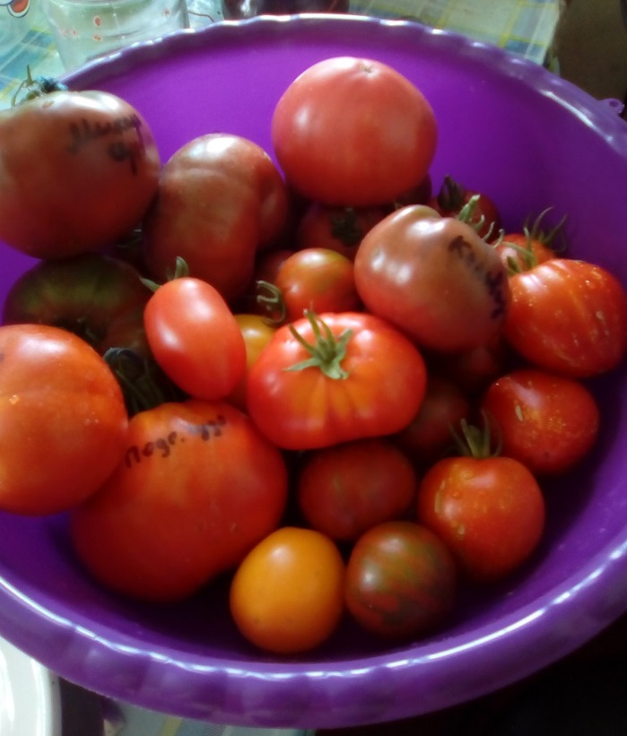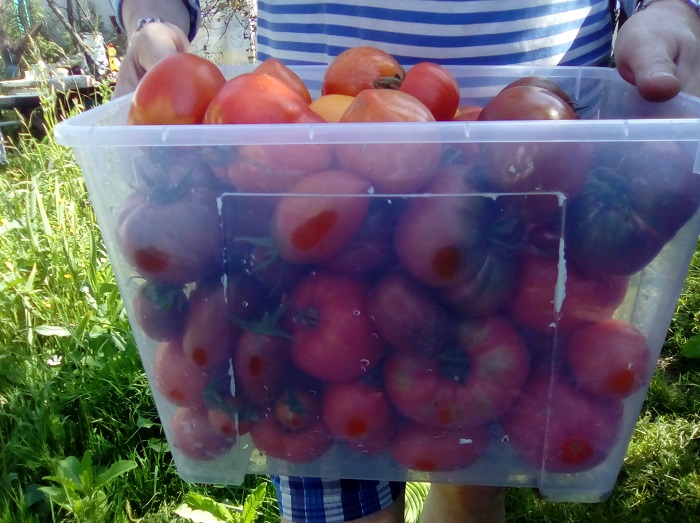А вот наш первый сбор помидор. До этого таскали по несколку штук и пробовали разные сорта