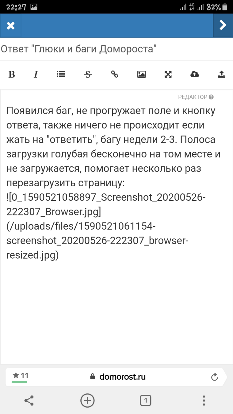 Появился баг, не прогружает поле и кнопку ответа, также ничего не происходит если жать на "ответить", багу недели 2-3. Полоса загрузки голубая бесконечно на том месте и не загружается, помогает несколько раз перезагрузить страницу:
