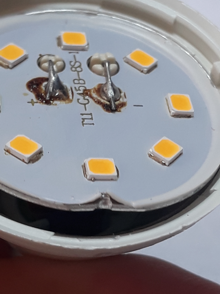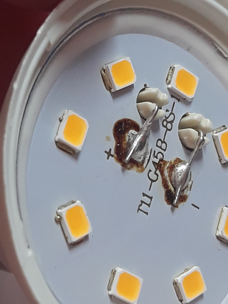 @Схемотехник да так и есть, казалось бы чему там приходить в негодность...эта лампа судя по состоянию сильно не перегревалась, а светодиод все равно испортился, причем так необычно они портятся - лампа мигает судорожно пару минут и потом все время делает попытки разжечься, судя по месторасположению точки повреждение произошло в месте где проводник соединяется с кристаллом, теперь надо додуматься почему же такое происходит....