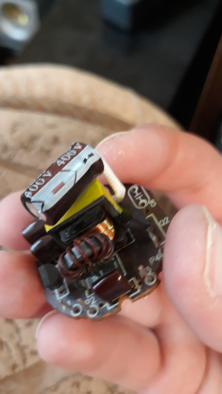 Внутри неё нет никаких радиаторов, никаких LED драйверов, но есть ЭПРА, простой и китайский ЭПРА. Который кстати почернел за столько лет работы: