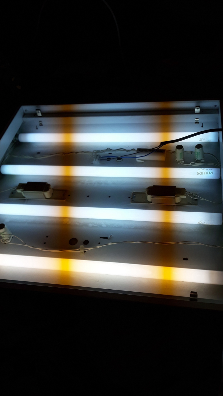 Две верхние в третьем по счету светильнике - китайский ширпотреб TDM 640, они кстати уже вышли из строя. В остальном там почти все лампы Philips TL-D 18w 54/765 и Osram L18W/765.